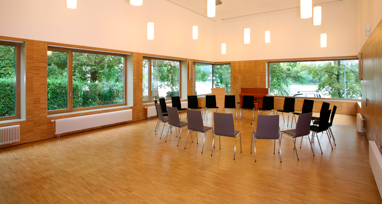 In seiner Farbe nimmt das Gemeindehaus Bezug zum Sandstein der Kirche. In Glas aufgelöste Saalecken und ein breites Panoramafenster im Sitzungsraum inzenieren den Blick rheinauf- und rheinabwärts.